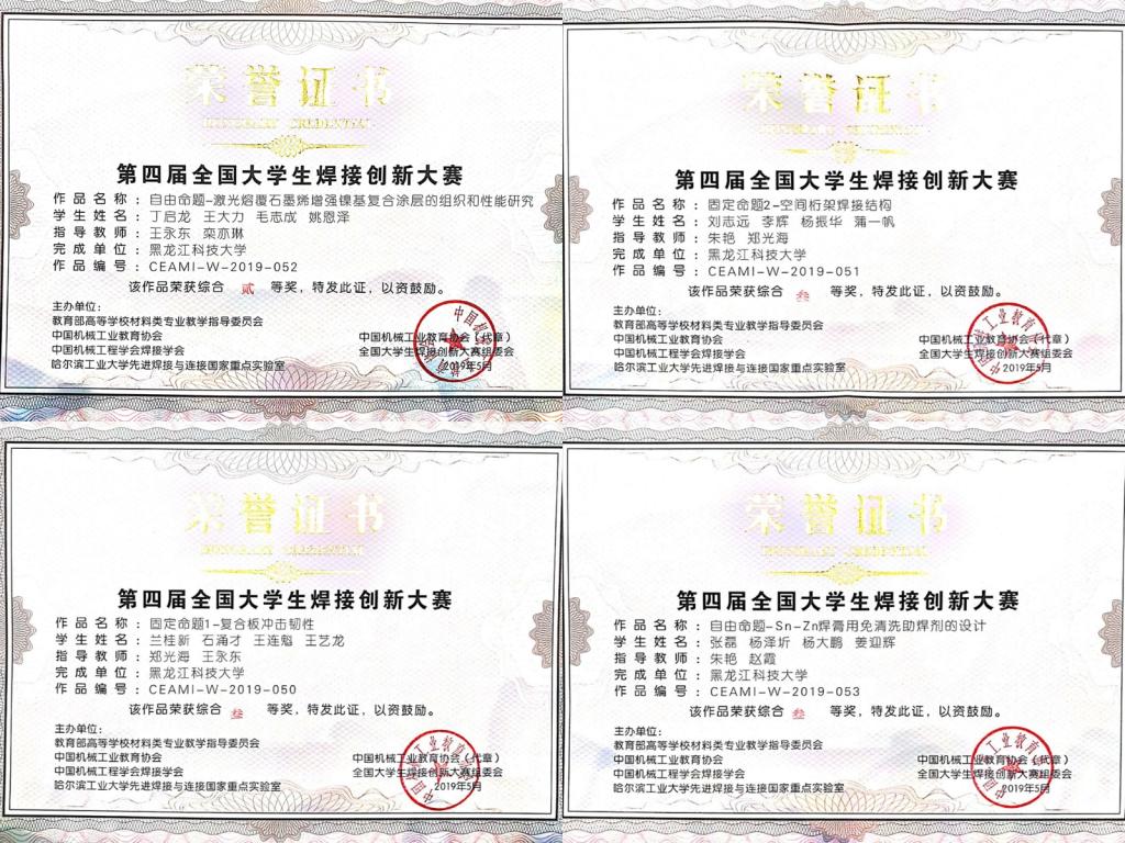 经大赛组委会初赛选拔,共有来自哈尔滨工业大学、天津大学、江苏大学、哈尔滨理工大学、乐鱼网站_乐鱼(中国)等53所省内外高校的163支参赛队伍进入决赛,经过激烈角逐,乐鱼网站_乐鱼(中国)材料科学与工程学院焊接技术与工程专业的4支参赛队在王永东、郑光海、朱艳等焊接教学团队教师的指导下取得佳绩,焊接15级丁启龙同学的团队作品《激光熔覆石墨烯增强镍基复合涂层的组织和性能研究》获得自由命题组二等奖,焊接15级张磊同学的团队作品《Sn-Zn焊膏用免清洗助焊剂的设计》获得自由命题组三等奖,焊接15级刘志远同学的团队作品《空间桁架焊接结构》和焊接15级兰桂新同学的团队作品《复合板冲击韧性》获得固定命题组三等奖。