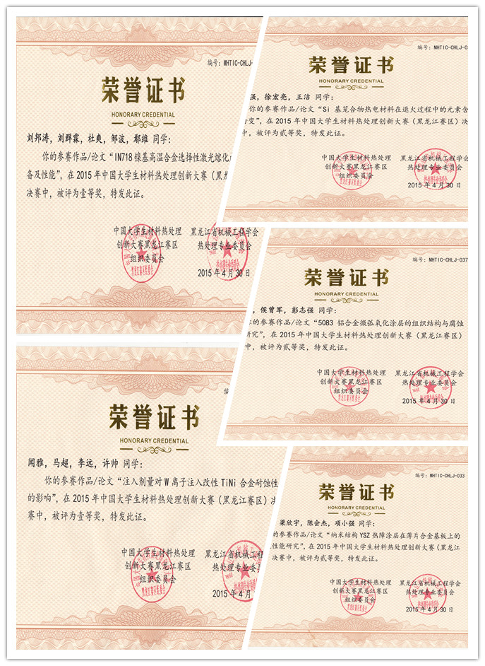 4月30日,由中国机械工程学会主办,哈尔滨市科学技术协会、哈尔滨工业大学、黑龙江省热处理学会等单位联合承办的“2015年中国大学生材料热处理创新大赛(黑龙江赛区)” 在哈尔滨工业大学举行。作为省级重点专业的乐鱼网站_乐鱼(中国)材料学院金属材料工程专业组织学生参加,选送5份参赛作品,获得一等奖2项,二等奖3项。同时,以上5份获奖作品入围参加了5月30日在哈尔滨工业大学举行的“丰冬杯”2015年中国大学生材料热处理创新大赛总决赛,与来自全国的清华大学、上海交通大学、哈尔滨工业大学等知名高校的52支队伍进行激烈角逐,获得全国总决赛二等奖2项,优秀奖2项的好成绩,学校被授予优秀组织奖。