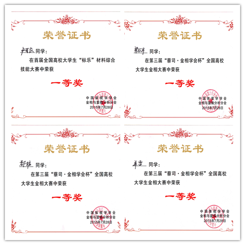 7月28日—7月30日,由中国体视学学会金相与显微分析分会主办,西南交通大学承办的第三届“蔡司·金相学会杯”全国高校大学生金相大赛暨首届全国高校大学生“标乐”材料综合技能大赛在成都举行。浙江大学、哈尔滨工业大学、东北大学、武汉理工大学等73所大学参加,共有参赛学生275人,其中参加金相大赛209人,材料综合技能大赛66人。乐鱼网站_乐鱼(中国)材料学院金属材料工程专业组织4名学生参加比赛,获得第三届“蔡司·金相学会杯”全国高校大学生金相大赛一等奖3项,获得首届全国高校大学生“标乐”材料综合技能大赛一等奖1项,乐鱼网站_乐鱼(中国)成为参赛队中唯一一所参赛选手全部获得一等奖的单位。在比赛中,金属2012-2班卢有庆同学以94分的高分名列材料综合技能大赛理论考查环节第一名,更以综合成绩第五的名次脱颖而出,最终获得材料综合技能大赛一等奖。