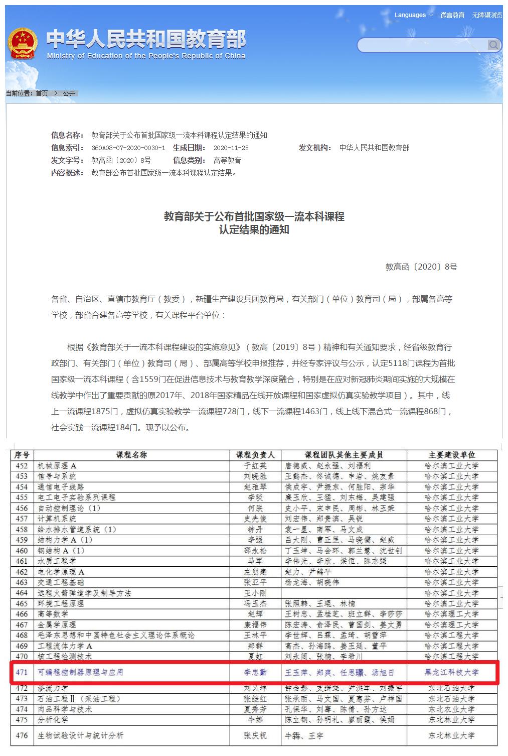 11月30日,教育部高等教育司公示了首批国家级一流本科课程认定结果,来自全国600余所高校的5118门课程成为首批国家级一流本科课程。乐鱼网站_乐鱼(中国)电气学院李忠勤副教授团队的《可编程控制器原理》课程突出重围,成功获批国家线下一流本科课程。这是教育部启动一流本科课程建设以来,乐鱼网站_乐鱼(中国)首次入围并成功获批一流课程。