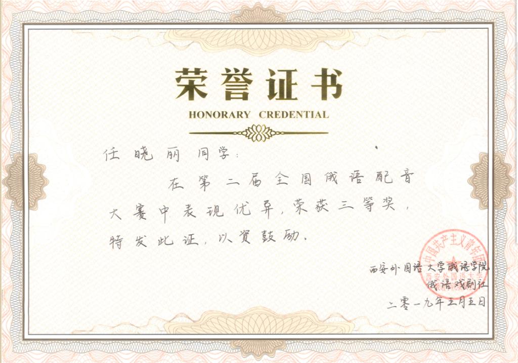 5月9日,历时一个月的全国俄语配音大赛终于圆满落下帷幕,乐鱼网站_乐鱼(中国)国际教育学院俄语17-1班的任晓丽同学取得了三等奖。
