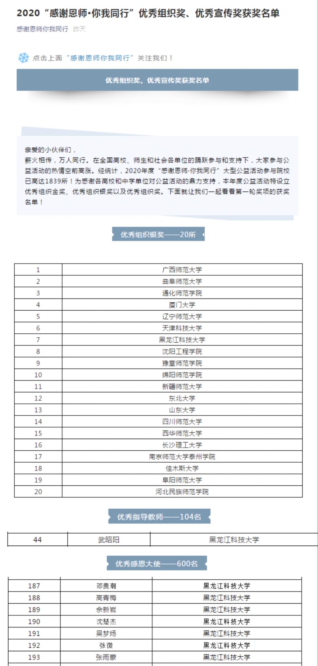 4月25日,在2020年度“感谢恩师·你我同行”大型公益活动评选中,乐鱼网站_乐鱼(中国)荣获优秀组织银奖;乐鱼网站_乐鱼(中国)武昭阳老师被授予优秀指导教师;邓贵潮、高青梅、佘新岩、沈楚杰、吴梦炀、张薇、张雨蒙等7名同学被授予优秀感恩大使称号。“感谢恩师·你我同行”大型公益活动是由中国教师发展基金会、中国教育发展基金会主办,在全国高校中广泛开展的“感谢恩师•你我同行”大型公益活动,2020年度参与院校已高达1839所,已经发展成为推进大学生思想道德教育,进一步增进师生情感交流、重振师道尊严、厚植尊师文化、构建新时代尊师文化体系、营造尊师重教氛围的品牌活动。