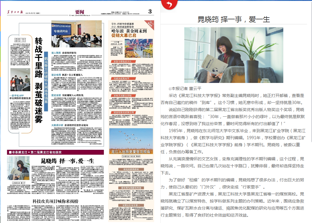 4月27日,《黑龙江日报》刊发了对晁晓筠的采访报道。现将全文转发,以便学习交流。
