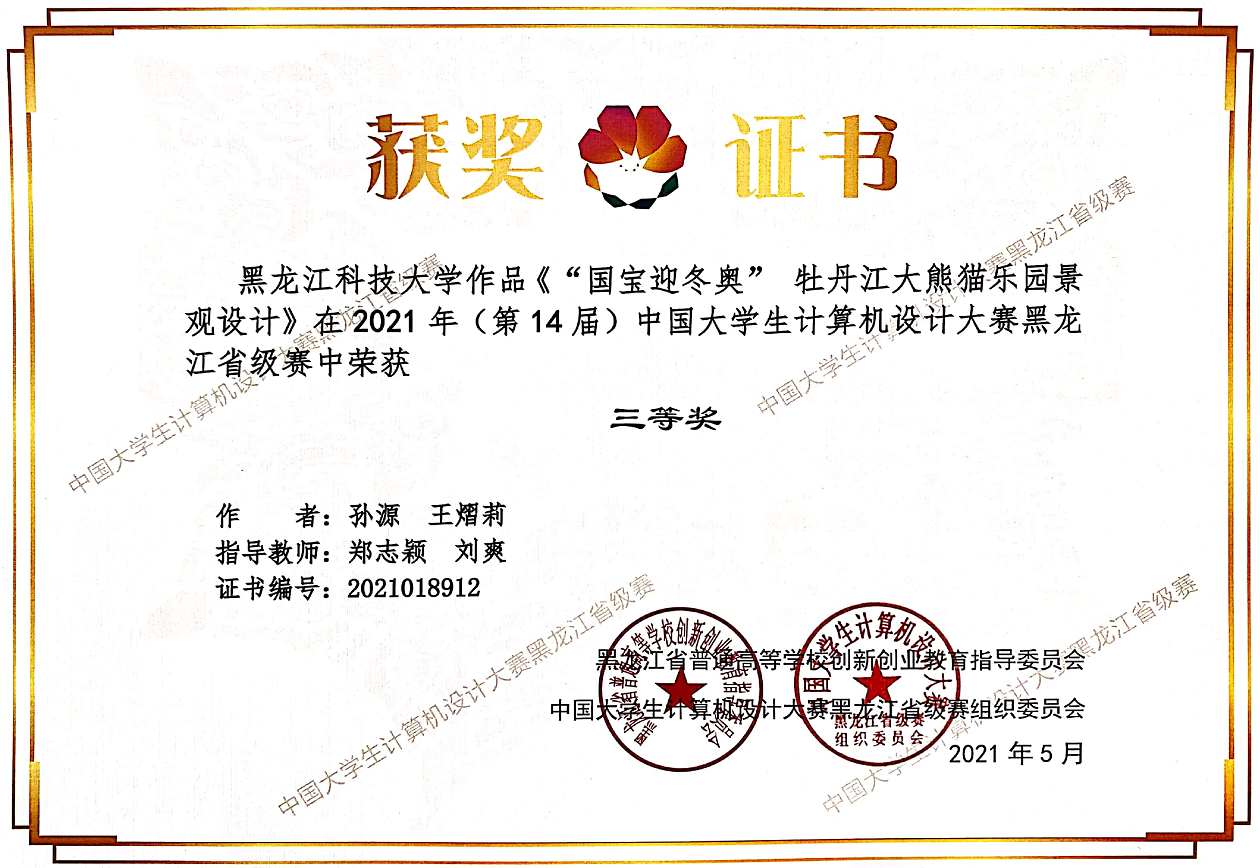 近日,2021年第十四届中国大学生计算机设计大赛黑龙江省赛落下帷幕。经过多日角逐,由建筑工程学院郑志颖、刘爽老师指导风景园林专业2018级学生孙源、王熠莉完成的作品《“国宝迎冬奥”牡丹江大熊猫乐园景观设计》,荣获大赛数媒静态设计专业组三等奖。