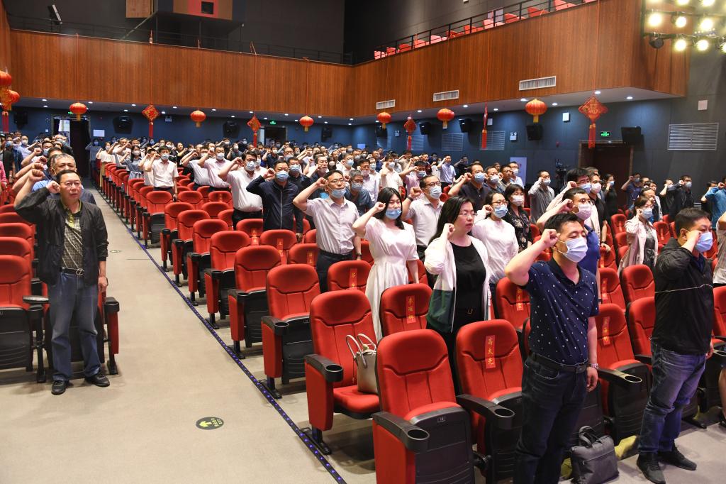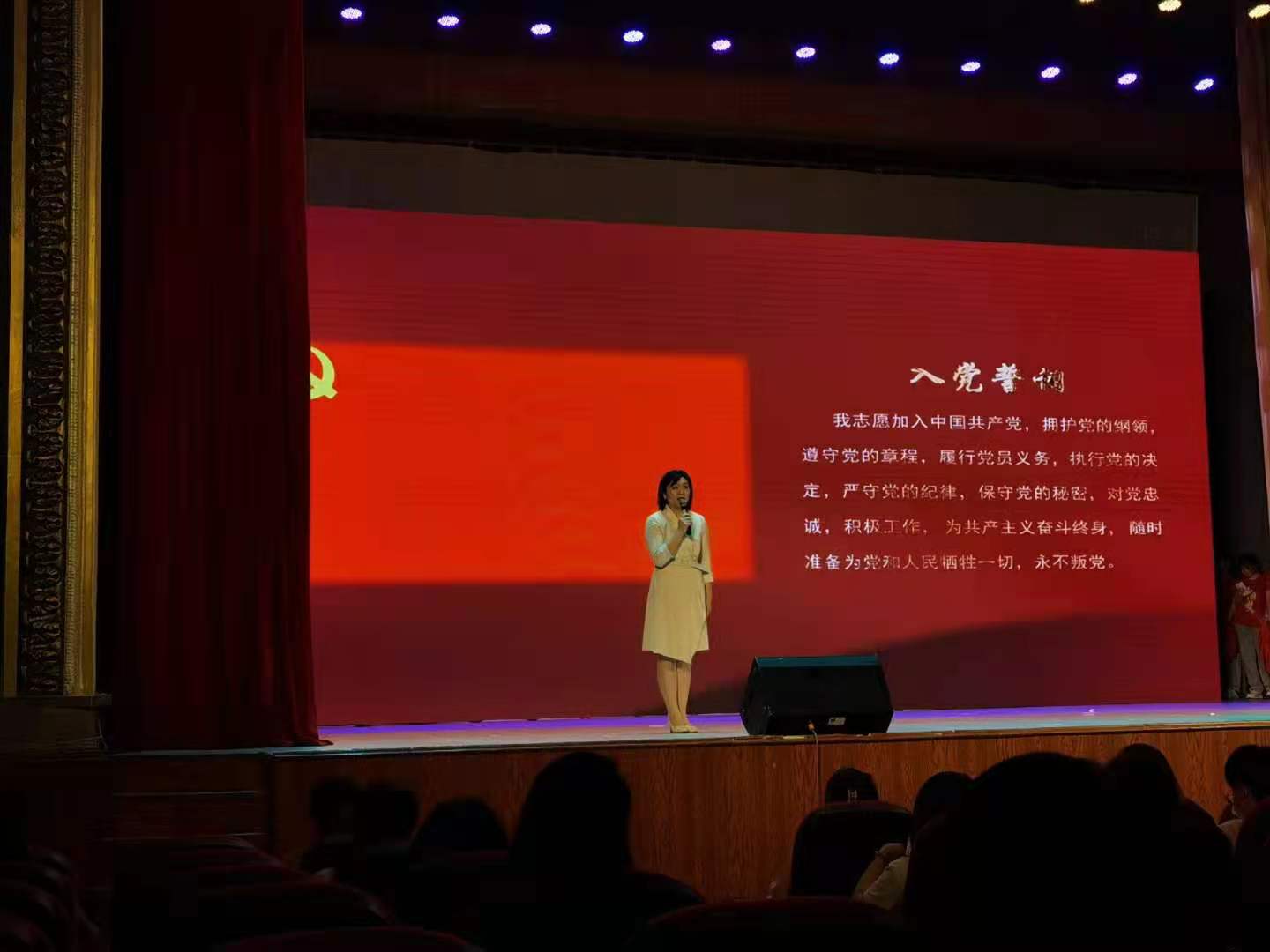 音乐党课中间,与会全体党员面向党旗,高举右手,重温了入党誓词,庄严而坚定的宣誓声响彻会堂。