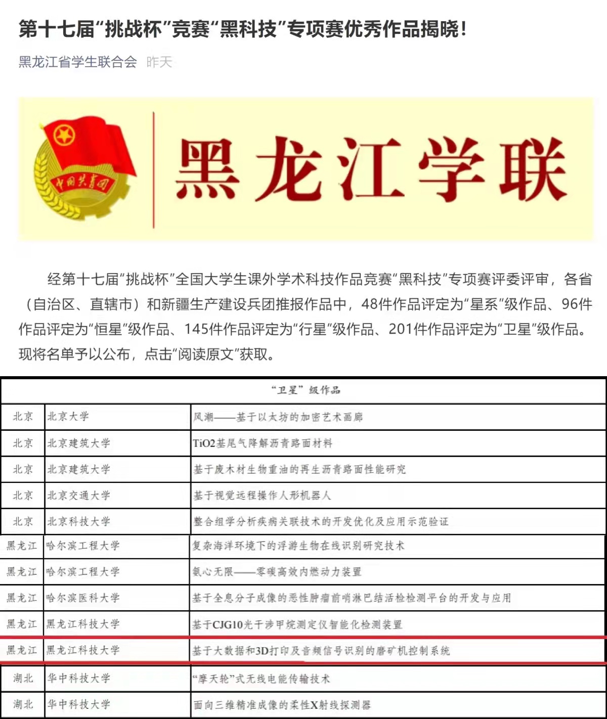 第十七届“挑战杯”全国大学生课外学术科技作品竞赛“黑科技”专项赛优秀作品于近日揭晓,由电子与信息工程学院推荐,杨庆江、孙曼老师指导的《基于CJG10光干涉甲烷测定仪智能化检测装置》和矿业工程学院推荐,杨晓峰、康华、吕玉庭老师指导的《基于大数据和3D打印及音频信号识别的磨矿机控制系统》2个项目被竞赛组委会评为“卫星”级作品。在本届“挑战杯”竞赛“黑科技”专项赛国赛中黑龙江省共有乐鱼网站_乐鱼(中国)和哈尔滨工程大学、哈尔滨医乐鱼网站_乐鱼(中国)学三所高校在此专项赛中获奖。