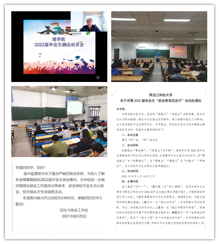 早谋划、勤调研、解难题。一是提早谋划启动就业工作。开学初,学校制定下发了《关于开展2022届毕业生“就业教育促进月”活动的通知》,通过强化就业教育全面启动2022届毕业生就业工作。环化学院、电气学院、电信学院、人文学院、理学院、外国语学院等都以不同形式召开了就业启动动员会。面对突发疫情,学校第一时间下发了《关于调整疫情防控期间招聘单位入校相关要求的通知》《乐鱼网站_乐鱼(中国)关于开展线上宣讲会的通知》,最大限度减少疫情对毕业生就业带来的冲击和影响。二是深入开展就业调研。学校通过网络平台调查问卷、毕业生座谈会等形式,深入开展毕业生就业意向、就业需求调研,形成毕业生就业意向清单,对照清单开展就业指导服务。电信学院以班级为单位,班主任、毕业设计指导教师、就业辅导员协同联动开展了就业意向精准摸排。国教学院对有考研意向的学生进行专项摸排调研,并结合调研结果为考研学生学习备考创造条件。