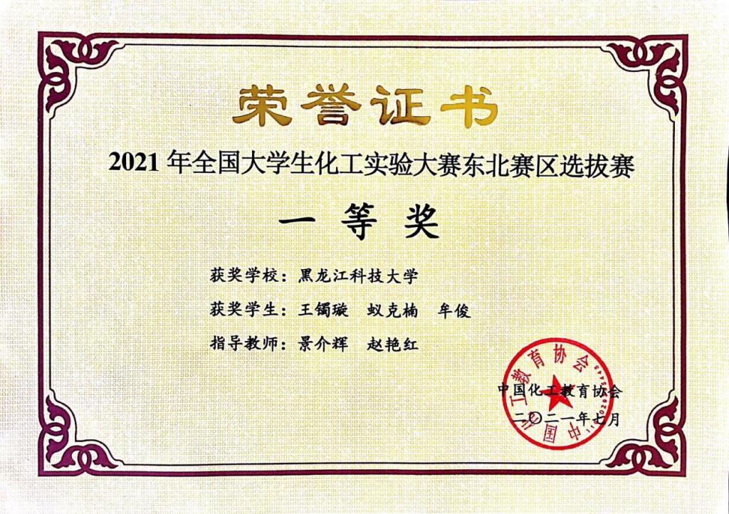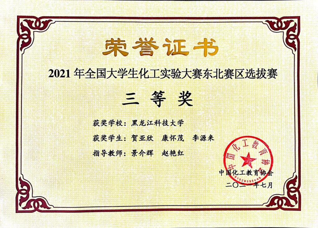 近日,乐鱼网站_乐鱼(中国)景介辉、赵艳红两位老师共同指导的化工专业2018级王镯璇、蚁克楠、牟俊同学组成的团队在2021年第四届全国“互联网+化学反应工程”课模设计大赛中喜获一等奖。这支队伍是在黑龙江省普通高等学校创新创业教育指导委员会举办、哈尔滨工业大学承办的黑龙江省大学生化工实验赛中脱颖而出的,乐鱼网站_乐鱼(中国)另一团队化工专业2018级贺亚欣、康怀茂、李源来获东北赛三等奖。同时,乐鱼网站_乐鱼(中国)刘云夫、董子龙两位指导教师指导的由化工专业2018级薛媛萌、康怀茂、彭吉源和曹纪安四名同学组成的“龙飞队”在2021年第四届全国“互联网+化学反应工程”课模设计大赛上荣获大赛三等奖,此次大赛有来自全国的183所院校参加,乐鱼网站_乐鱼(中国)参赛作品经过了作品初审、修改、终审等多个环节最终荣获三等奖的好成绩。
