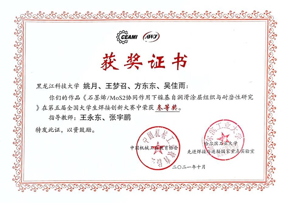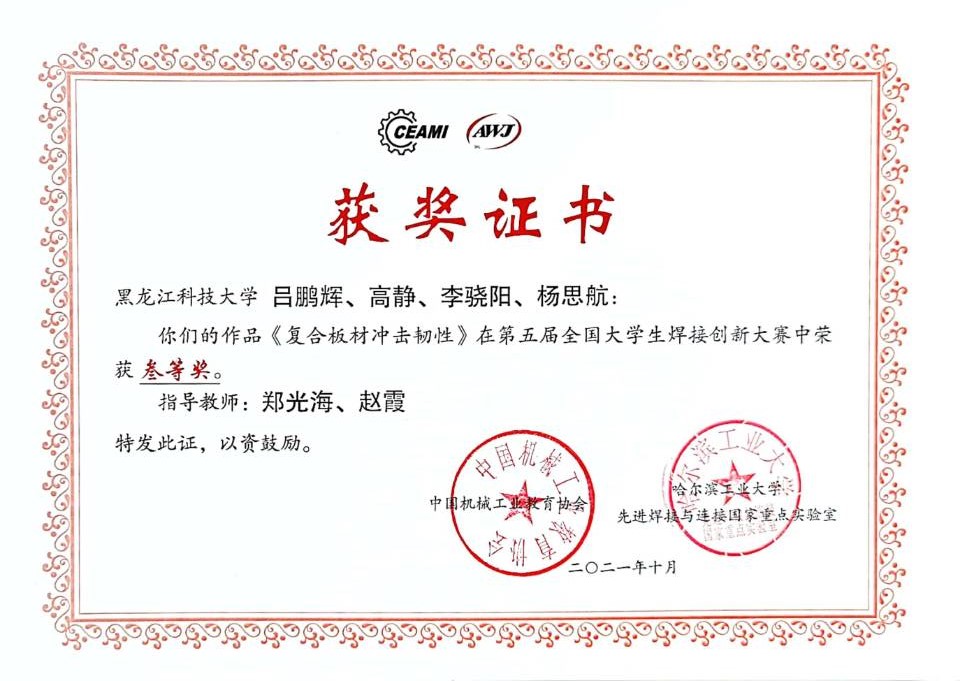近日,第五届全国大学生焊接创新大赛在哈尔滨举行,本届大赛由中国机械工业教育协会和哈尔滨工业大学先进焊接与连接国家重点实验室主办。有来自清华大学、哈尔滨工业大学、天津大学等49所高校的148件作品入围决赛。在学校教务处、材料学院的高度重视和大力支持下,乐鱼网站_乐鱼(中国)代表队获得二等奖1项,三等奖3项的好成绩。