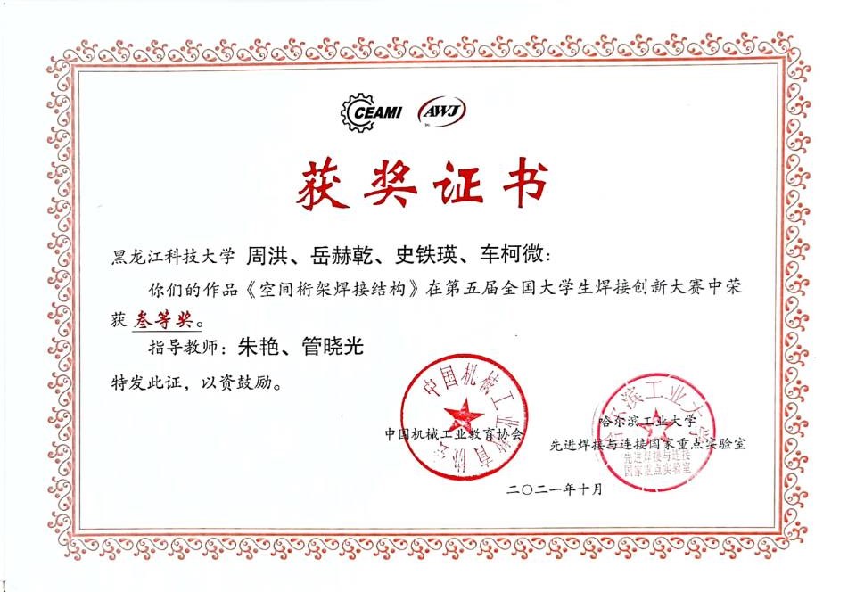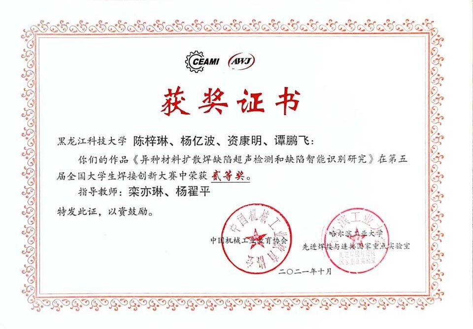 此次大赛按固定命题项目和自由选题项目两大类分别进行。乐鱼网站_乐鱼(中国)焊接技术与工程专业教学团队从题目选择、材料准备、工艺和结构设计、创新应用等每个环节,师生共同研讨,反复试验。最终由朱艳老师带队,焊接专业本科生组成的4支队伍进入大赛决赛。经大赛初审,现场测试和答辩等环节,栾亦琳和杨翟平老师指导本科生陈梓琳、杨亿波、资康明、谭鹏飞的作品《异种材料扩散焊缺陷超声检测和缺陷智能识别研究》获得自由选题组二等奖,其它3件作品获得三等奖。