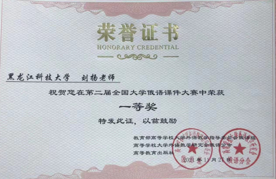 大赛历时4个月,有来自北京航空航天大学、南京大学、国防科技大学等二十余所高校的教师参赛。大赛采取线上比赛形式,参赛教师基于组委会指定教材,选择单元授课内容制作参赛作品,参赛作品内容涵盖实践课、语法课、文化课等多门俄语专业主干课程。经过严格评审与激烈角逐,大赛最终决出一等奖3名,二等奖5名,三等奖8名。刘扬老师经过精心的准备,最终获得第二届全国大学俄语课件大赛一等奖的好成绩。