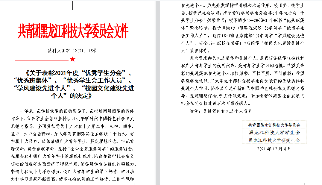 发挥思想引领作用,弘扬先进之风。校学生会、研究生会在纪念“一二 ·九”运动86周年的时间节点,围绕聚焦主责主业,扎实推进学生会组织各项改革工作为重点,在全校范围内组织开展“优秀学生分会”“优秀班集体”“优秀学生会工作人员”等评选活动,选树优秀集体30余个,先进个人300余人,涌现出了一大批以通信18-1班崔家健、安全19-1班杨金博为代表的“六有”大学生,展现当代青年朝气蓬勃的精神面貌和风采。马克思主义学院团委、外国语学院团委、材料学院团委纷纷以表彰大会、表彰座谈会、主题班会等形式开展表彰活动,树立了一批可爱、可信、可贵、可为的乐鱼网站_乐鱼(中国)青年典型,在青年学生中构建见贤思齐、力争上游的积极导向。