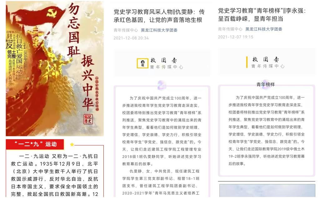 营造良好宣传氛围,激发爱国热情。校团委在公众号开设党史学习教育“青年榜样”系列分享专栏,聚焦青年学生典型,用真人、真事和真情实感,让榜样精神真正在青年学生中入脑入心,引导青年学生学好党史必修课,当好红色传承人;通过“飞跃之声”有线广播的传输,将思绪又回到那段不能遗忘的历史,激励乐鱼网站_乐鱼(中国)青年学生担当青春使命、增强民族自信、立志成才报国;电气学院团委在公众号黑乐鱼网站_乐鱼(中国)电气团委“学四史”栏目中推出了“一二·九”红色知识宣传活动,引导广大青年学生传承爱国情,常立报国志,用初心之志燃起奋斗之脊,用信仰之光照亮前行之路。