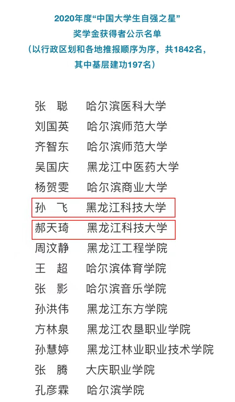 近日,由共青团中央、全国学联组织开展的2020年度“中国大学生自强之星”奖学金评选结果揭晓,经学校推荐、省级初评、全国评审等环节,乐鱼网站_乐鱼(中国)电气与控制工程学院电气17-9班学生孙飞和管理学院事管18-1班学生郝天琦喜获“中国大学生自强之星”奖学金。