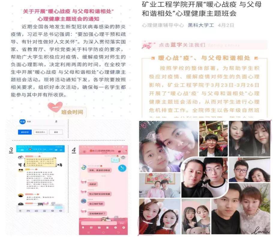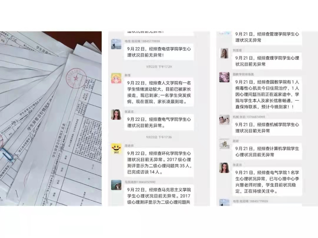 学校融合家庭、医院等资源,共同促进大学生健康成长。一是强化家校协同。通过制作“给学生家长的一封信”,宣传普及心理健康知识,提高家长对抑郁症等心理疾病的正确认识。针对重点关注学生开展网络家访750余人次,强化家校协同、信息互通,形成家校育人合力。二是加强医校合作,与哈尔滨第一专科医院签订合作协议,建立绿色快速诊疗便捷通道,今年有效危机干预和转介172人,邀请第一专科医院徐佳主任为20000余名学生开展了心理健康知识讲座,保障学生生命安全和校园稳定。