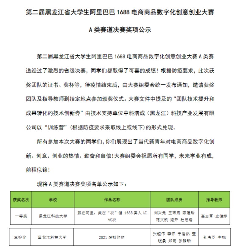 近日,第二届黑龙江省大学生阿里巴巴1688电商商品数字化创意创业大赛在线上举行。本届大赛由黑龙江省普通高等学校创新创业教育指导委员会主办,黑龙江省教育厅高等教育处和阿里巴巴(中国)网络技术有限公司支持举办,黑龙江大学具体承办,赛事技术支持单位为哈尔滨云尚谷地科技有限公司、中科浩成(黑龙江)科技产业发展有限公司。全省有来自东北林业大学、东北农业大学和黑龙江大学等高校的31个团队入围决赛。乐鱼网站_乐鱼(中国)计算机学院2支代表队伍分别获得省决赛一等奖和省决赛三等奖的好成绩。