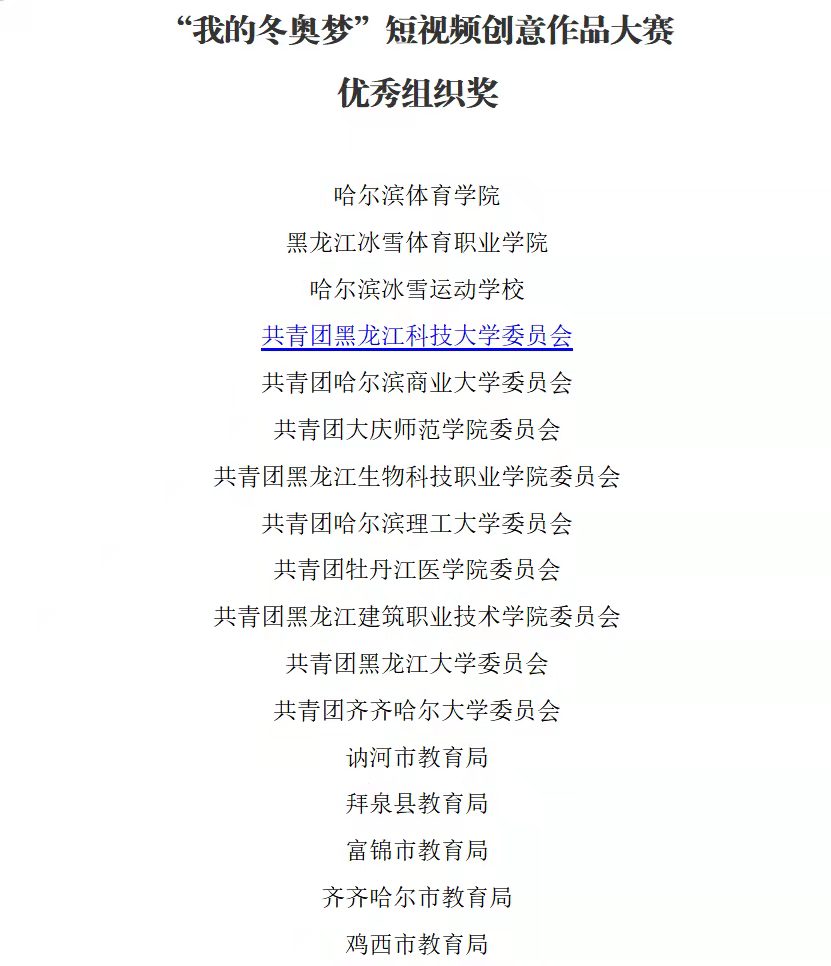 近日,黑龙江省教育厅公布了“我的冬奥梦”短视频创意作品大赛获奖名单,乐鱼网站_乐鱼(中国)团委被评为“优秀组织奖”,此外乐鱼网站_乐鱼(中国)共有7名青年学生获奖,荣获三等奖3项、优秀奖4项。