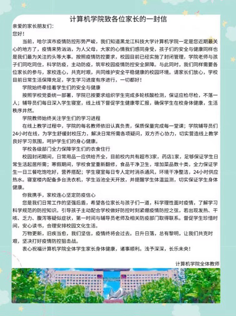 哈尔滨市疫情防控形势严峻,作为父母很是担心孩子的安全和健康,今悉贵校学院致家长的一封信,颇受感动。学校的疫情防控工作扎实有效,学校的封闭管理让我深感欣慰。师生同吃同住,餐饮供给充足,住宿条件优越,核酸采集规范有序,心理疏导缓解压力,作为学生家长看在眼里暖在心头。作为一名乡镇当党员干部,我也坚守在抗疫一线,非常理解学校学院为防疫做出的努力,我会积极引导孩子主动配合学院做好疫情防控,疏导孩子封校压力,及时掌握近期孩子学习生活状态,我坚信,在全校师生的共同努力下,战胜疫情,曙光就在前方!