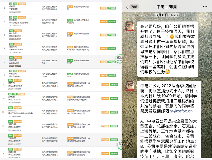 强化宣传、院企互动,就业关怀人心“暖”。学院主动宣传学生专业优势和特点,与多家用人单位形成了有效对接。为鼓励学生多元就业,鼓励学生积极参加各项科技创新比赛,经努力沟通无锡信捷电气股份有限公司对提出违约的同学给出了免责、无违约金的签约条件,日出东方控股股份有限公司给出了专业对口、老师推荐、直接终试的优待条件,深圳市禾望电气股份有限公司主动提出为学院电子设计大赛或其他文体活动提供2万左右的赞助;深圳市盛弘电气股份有限公司由我院去年毕业生担任专场招聘负责人,以校友和hr的双重身份为意向学生介绍单位情况,吸引优质生源,目前有4人达成意向。