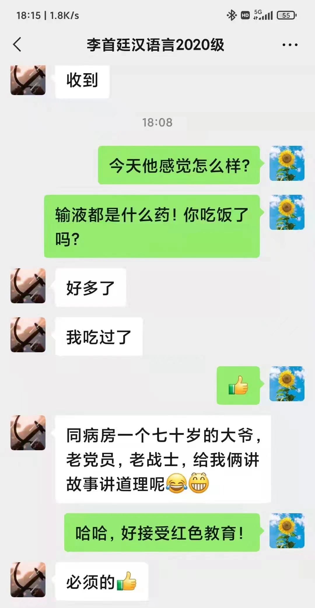 傍晚,昨天陪护患病小伙伴入院的小李同学从前方发回消息,一切安好。请各位关心我们学生的朋友放心。