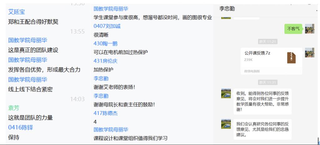 公开课结束后进行听课反馈,收到督学、教师反馈表14份。学校督学周广林教授结合课程专业教学特点进行点评和剖析,认为这是一次成功的公开课,最大的成功在于新颖的课程教学设计,真正全方位体现以学生为中心的教学理念,能够按照“提出问题→分析问题→解决问题”的思路授课,培养学生分析问题和解决问题的能力,值得面向全校推广和应用。参加课程观摩的教师总体对公开课线上教学效果表示肯定,认为授课老师精神饱满,准备充分,课前引导、课中互动等环节到位,语音语速适中,表达流畅,仪态自然,线上教学工具使用熟练,师生互动顺畅良好;同时,也对公开课提出了改进建议。