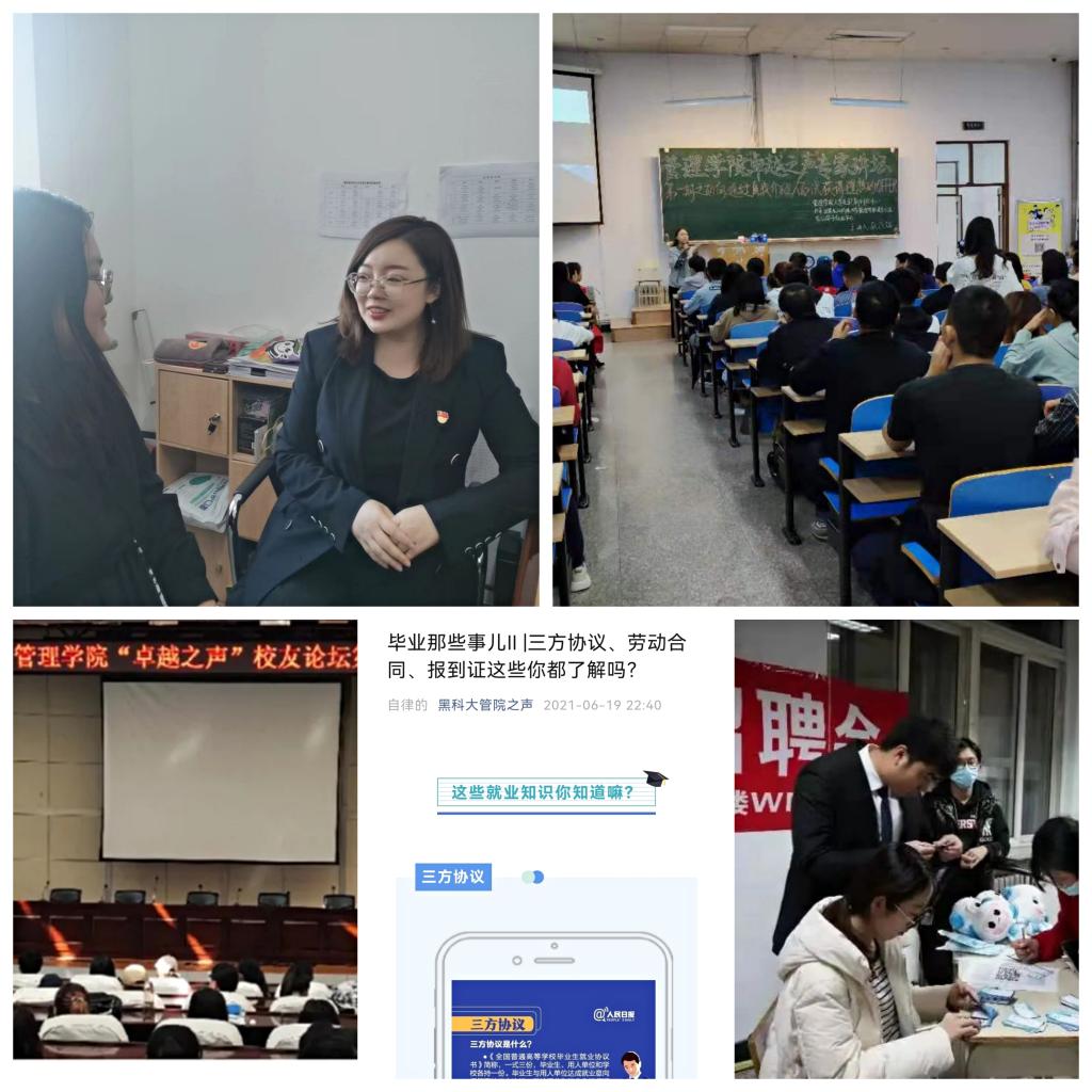 三、坚持把握“传”的联动点,传递信息传递真情,掌真况出实招。毕业班辅导员作为上情下达、下情上传的关键一环,她分别围绕学生考研、公考、求职、创业等方面开展了6次全面系统的就业摸排,累计推送就业信息7000余条,开通了“管院就业直通车”线上平台,及时帮助学生解决就业过程中遇到的各种问题。围绕中铁十五局、中建二局东北分公司、龙建路桥、新道用友等多家与我院长期共建企业的招聘实际,开展了双向专项调查。得益于学院“德知行思”人才培养特色,学生深受用人单位好评,并实现48名毕业生到上述单位成功就职。