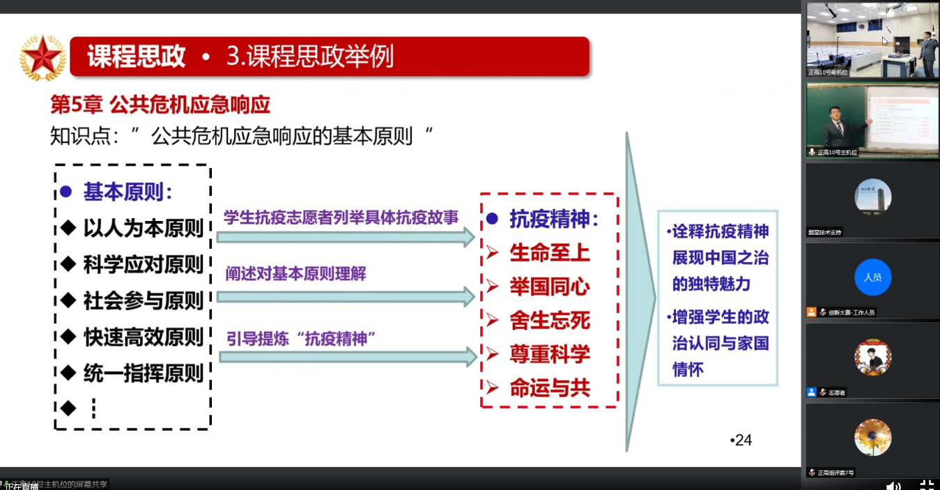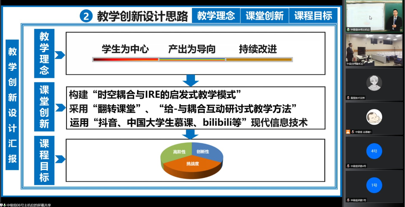 决赛过程中,选手充分展现了课程设计体系全面,逻辑清晰;注重以学生为中心创新教学;课程思政设计“如盐化水”“润物无声”;创新效果突出等教学亮点。