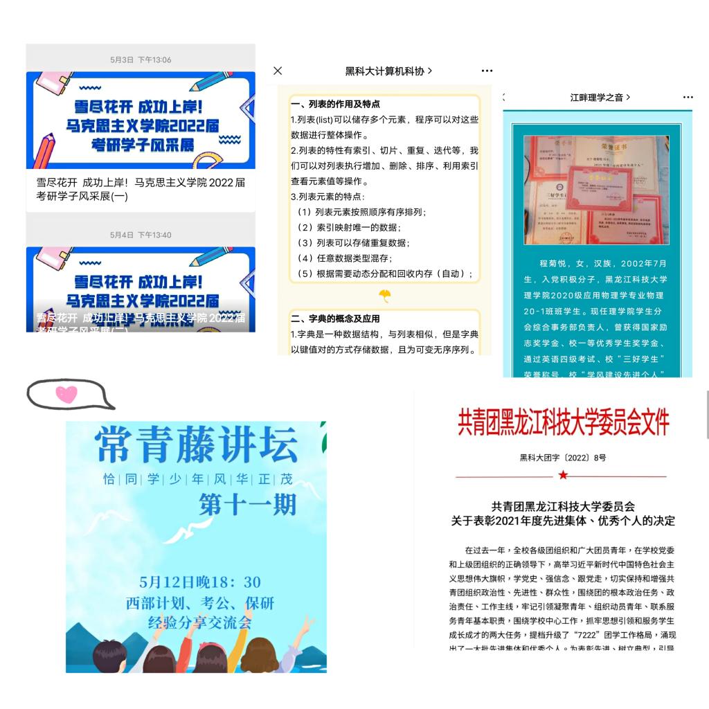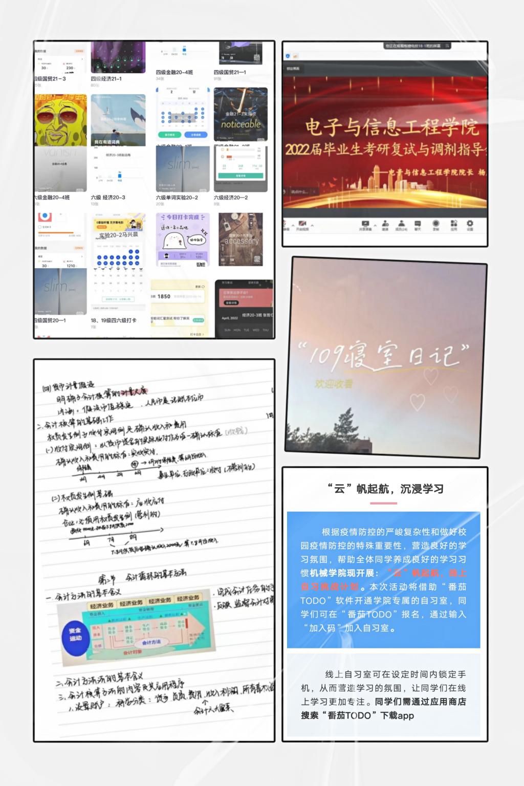 校团委结合“喜迎二十大、永远跟党走、奋进新征程”主题实践活动,组织开展了“喜迎二十大,奋进新征程”网络朗诵比赛、活动、“强国复兴有我”主题征文活动、2022年度“旗帜杯”征文比赛、“春意盎然,书香满园,佳作推荐,与君分享”云读书分享会等系列活动不断引导广大青年学生用文字、用声音表达自己的所见所闻所思所感。管理学院团委开展了“强学风‖Po出你的网课笔记,让你的努力有‘记’可循!”为主题的线上笔记评选活动,调动同学们的学习热情,提高同学们的知识文化素养,增强自我学习能力;电子与信息工程学院团委开展了2022届毕业生考研复试与调剂指导会,邀请了学院院长杨庆江、考研指导名师王晓磊为全体2022届考研同学进行复试和调剂指导,为过线同学们顺利考入理想学校保驾护航;经济学院团委开展了四六级单词打卡活动,鼓励大家积极应对英语四六级考试,营造一个良好的四六级冲刺学习氛围,提升同学们的英语水平。建筑工程学院团委开展了“一见寝心”寝室风采大赛,发挥寝室集体的凝聚力与团结力;机械工程学院团委开展了“云”帆起航,线上自习挑战计划,借助“番茄TODO”软件开通学院专属的自习室。