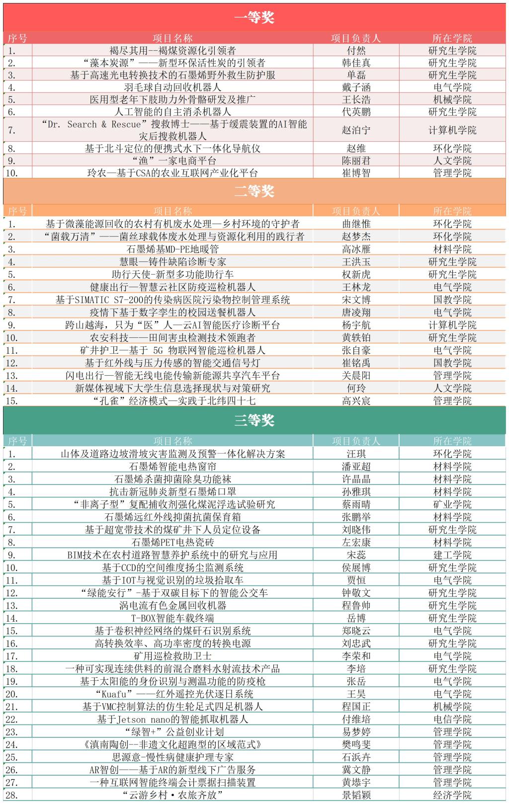比赛组成了以各学院相关专家和有关职能部门工作人员为主的评审委员会,经过为期三天的现场紧张评审和后期核算统计,最终,研究生学院研20-7班付然等同学申报的《褐尽其用--褐煤资源化引领者》等10项参赛作品荣获大赛一等奖,环化学院环境20-1班曲继惟等同学申报的《基于微藻能源回收的农村有机废水处理—乡村环境的守护者》等15项参赛作品荣获大赛二等奖,材料学院无机非21-2班孙雅琪同学申报的《抗击新冠肺炎新型石墨烯口罩》等28项参赛作品荣获大赛三等奖。同时,按各学院入选校赛项目数量和获奖项目名次赋分,最终评选出研究生学院、电气与控制工程学院团委、管理学院团委3个单位为本届“挑战杯”竞赛校赛优秀组织奖。