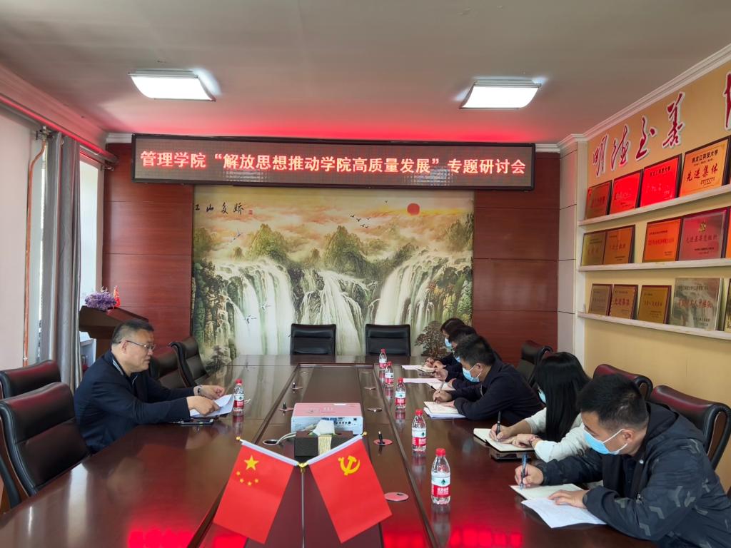 6月2日,管理学院召开党委理论学习中心组学习会暨“解放思想推动学院高质量发展”专题研讨会。会上,学院党委理论学习中心组成员紧紧围绕“解放思想推动学院事业高质量发展”这一主题并结合各自分管工作实际进行了专题研讨发言。发言中紧密结合学校党委关于能力作风建设年开展思想大讨论相关要求,高度聚焦解放思想、明确目标、提高能力、转变作风,深入剖析能力作风建设中存在的的问题和不足,并提出下一步整改措施。