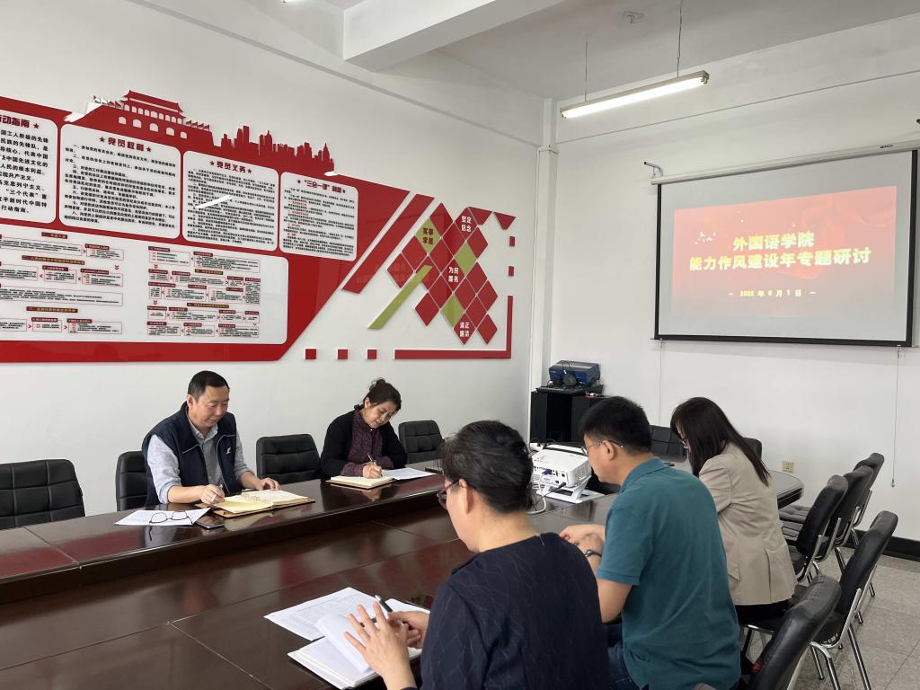 6月1日,外国语学院召开“能力作风建设年”专题研讨会。研讨会上,学院领导班子成员聚焦解放思想、转变观念,提升能力、破解难题,强化作风、推进落实,结合各自工作战线进行了研讨发言。