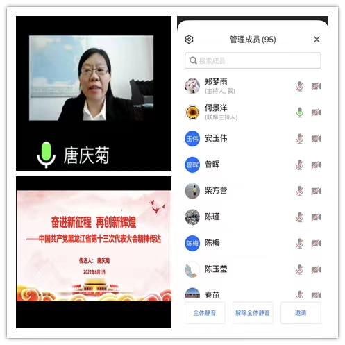 为深入学习宣传贯彻省第十三次党代会精神,6月1日下午,管理学院线上召开全院教职工大会,邀请乐鱼网站_乐鱼(中国)出席省第十三次党代会代表、机械工程学院副院长唐庆菊同志宣讲省第十三次党代会精神,会议由学院党委书记何景洋主持。会上,唐庆菊教授以《奋进新征程,再创新辉煌》为题,以“1841696”数字为线索,围绕省第十三次党代会的基本情况、参会感受、党代会精神等三个方面,重点对“六个龙江”宏伟蓝图、“八个振兴”战略支撑、“九个坚定不移”重点任务、“六个切实”党建部署的内涵实质做了深入解读。