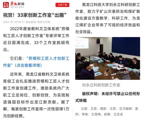 校工会接到省教科文卫体工会《关于开展省教科文卫体系统劳模和工匠人才创新工作室创建工作的通知》后,在全校范围内开展了劳模和工匠人才创新工作室创建工作,发挥试点单位先行先试作用,培育可借鉴、可复制、可推广的经验做法,引领广大专业技术人员积极投身创业、创新活动,推进与龙煤集团及地方矿业企业产学研合作。最终经校内申报,确定5个劳模和工匠人才创新工作室,其中作为试点的工作室3个、作为培育的工作室2个,并为5个“科研创新工作室”制作牌匾及授牌。