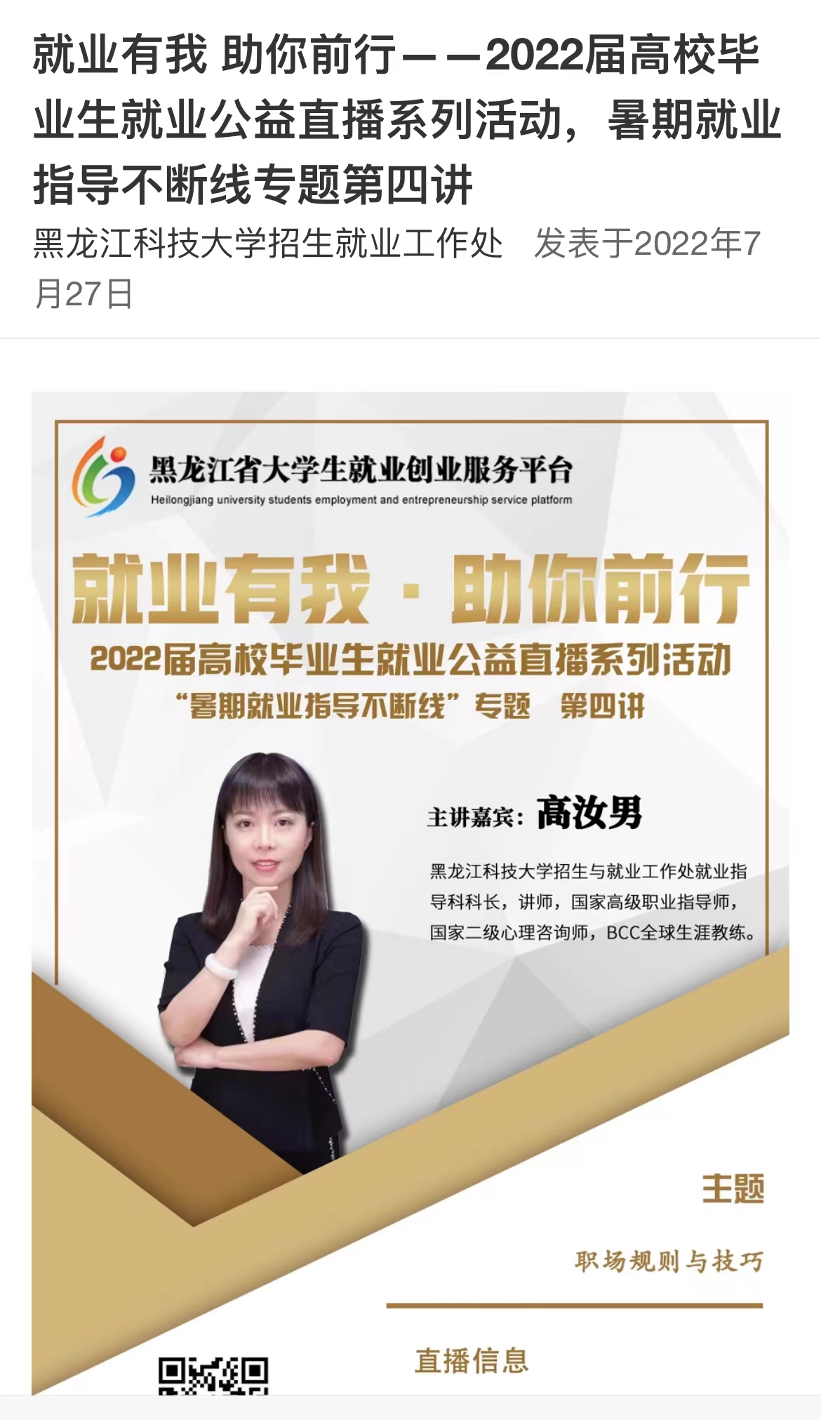 二是线上指导不打烊。学校持续向毕业生推送省教育厅组织的“就业有我,助你前行”公益直播课。依托学校就业微信平台,累计为毕业生提供线上就业指导咨询一百余人次。同时,招就处安排专人假期负责毕业生报到证改派、线上签约及解约办理、就业信息反馈处理、就业数据维护等各项事务工作,实时维护毕业生就业管理系统数据。