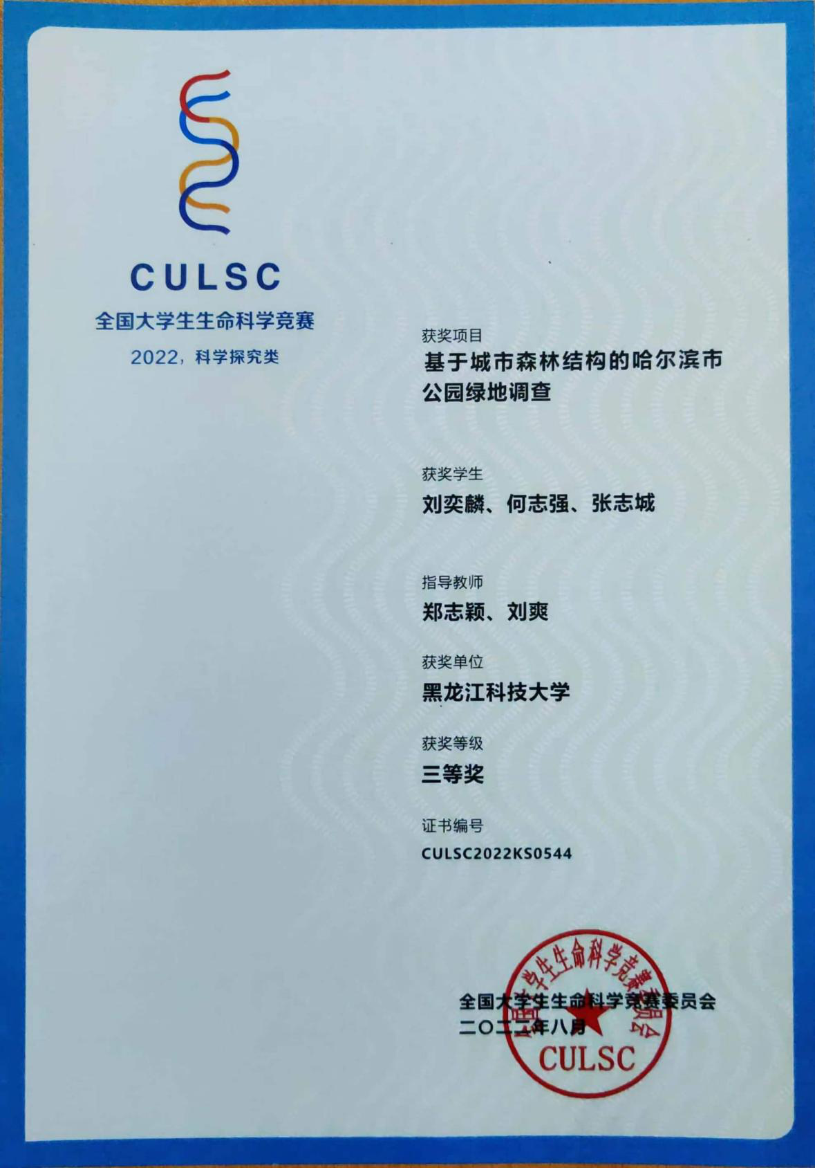 近日,由全国大学生生命科学竞赛委员会、高等学校国家级实验教学示范中心联席会及《高校生物学教学研究(电子版)》杂志社主办,由河南师范大学承办的2022年全国大学生生命科学竞赛(科学探究类)决赛落下帷幕,乐鱼网站_乐鱼(中国)建筑工程学院教师郑志颖、刘爽指导风景园林专业学生刘奕麟、何志强、张志城完成的参赛作品“基于城市森林结构的哈尔滨市公园绿地调查”在比赛中获得三等奖。