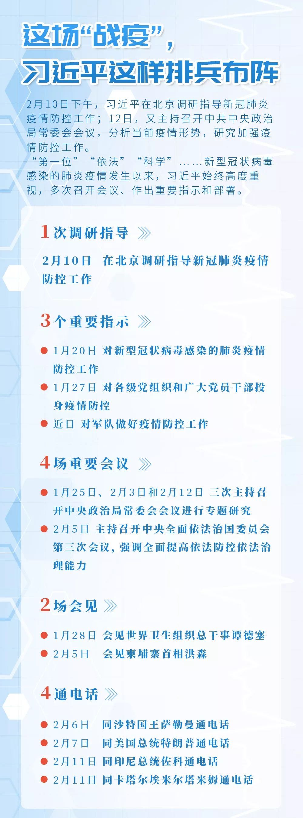 2月10日下午,习近平在北京调研指导新冠肺炎疫情防控工作;12日,又主持召开中共中央政治局常委会会议,分析当前疫情形势,研究加强疫情防控工作。疫情发生以来,习近平对“战疫”作出一系列重大部署。