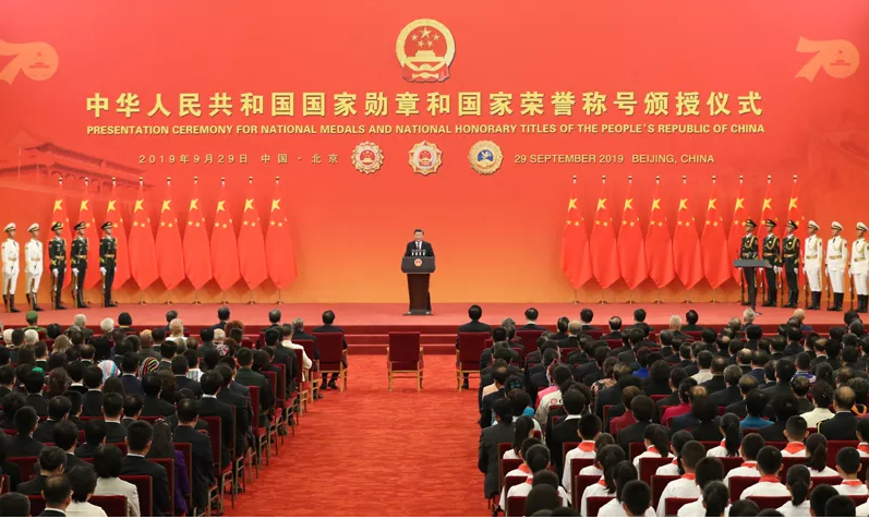 今天,在全国各族人民共同庆祝中华人民共和国成立70周年之际,我们在这里隆重举行仪式,将国家最高荣誉授予为国家建设和发展建立了卓越功勋的杰出人士和为促进中外交流合作作出杰出贡献的国际友人。