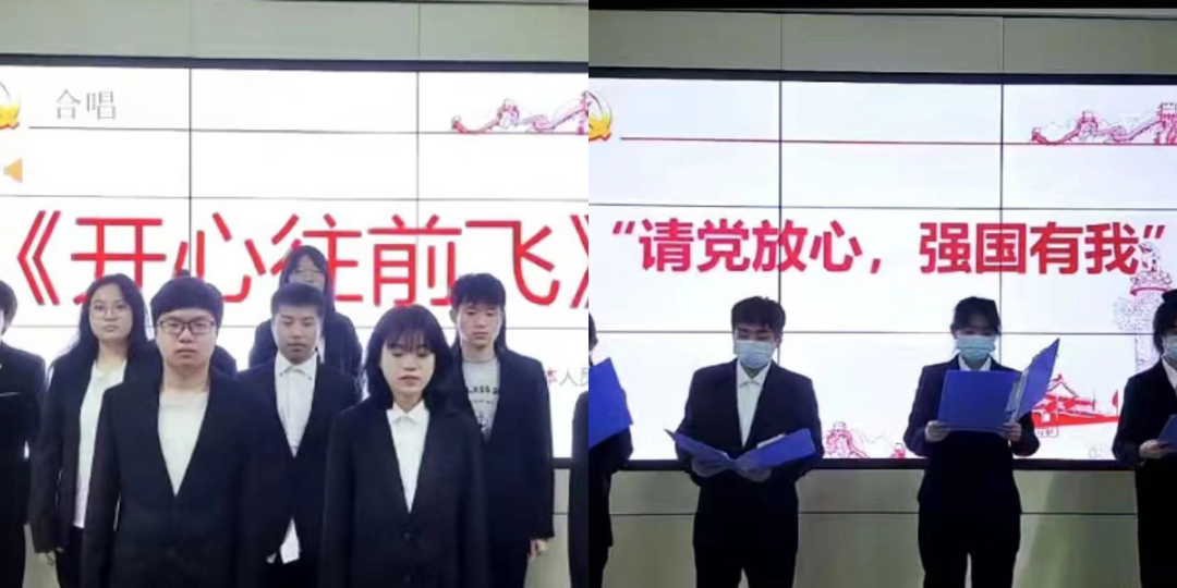 团委社会实践部的同学们带来歌曲《开心往前飞》,团委公关部的同学们带来朗诵《请党放心,强国有我》。
