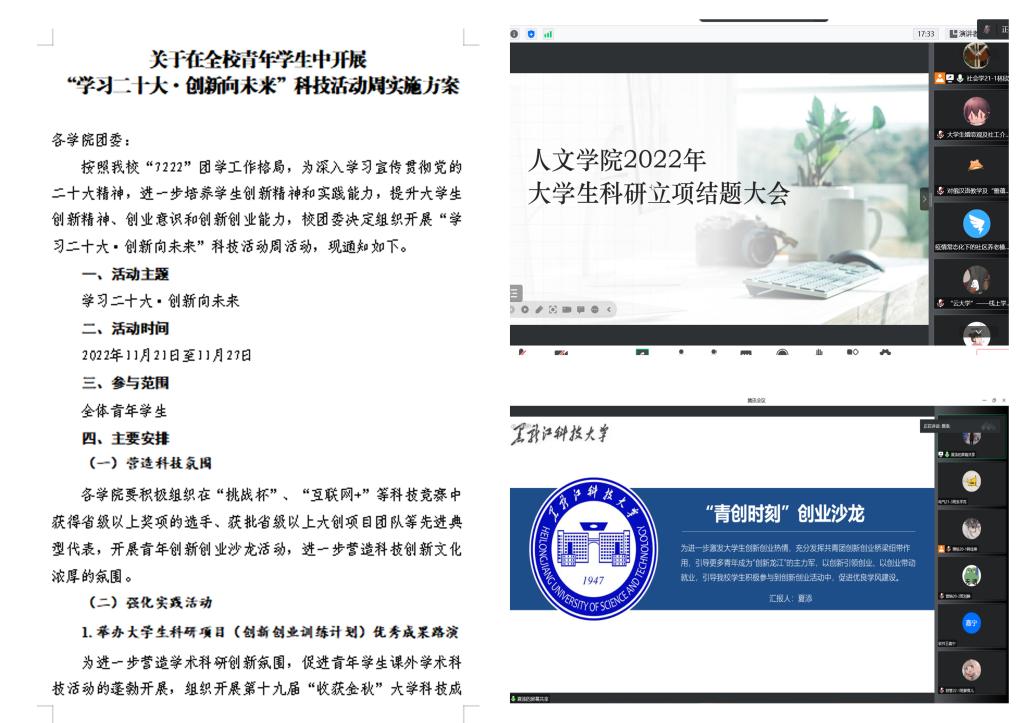 校团委制定下发了关于《关于在全校青年学生中开展“学习二十大·创新向未来”科技活动周工作实施方案》,各级团学组织积极响应、迅速行动,开展了“青创未来、你我同行”模型制作大赛”,“科技创青春、奋进新征程”标志设计大赛,“学习二十大、科普向青春”知识竞赛等形式多样、内涵丰富的科创活动。