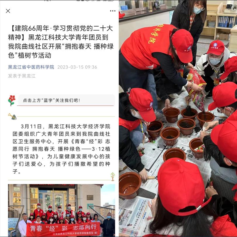 3月11日,学院志愿者们集体乘车出发前往哈尔滨市南岗区曲线社区卫生服务中心进行了主题为“青春‘经’彩,志愿同行”的实践活动,此次志愿服务活动曲线社区卫生服务中心、黑龙江省中医药科学院(省中医医院、祖研)发文表示感谢。一掊土,一滴水,一粒种,承载在花盆的不仅仅是一颗普通的花种,它蕴含的是大家对实践活动的热忱,种植花草的同时为社区增添了一抹色彩,更为社区的绿色建设贡献了自己的一份力量。