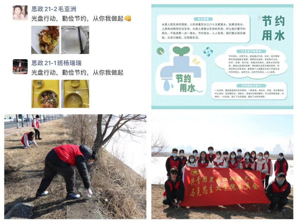 关注生态文明,树立环保风尚。“绿水青山就是金山银山”,组织我院青年学生聚焦生态文明教育、绿色生活实践、校园环境清洁等领域,开展垃圾分类知识宣传、厉行节约“光盘行动”、守护母亲河等活动,倡导低碳环保、垃圾分类、勤俭节约、关注生态,用实践行动将生态文明建设的种子根植于青年学生心中,潜移默化,扎根思想,形成共识,提升我院青年学生生态文明素养。
