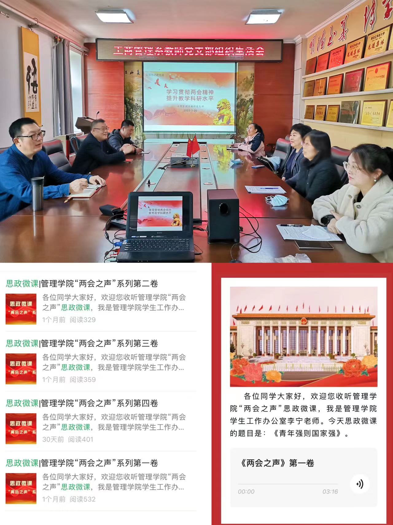 学院通过领导带头引领学、理论宣讲深入学、支部研讨交流学等多种形式,掀起了学习贯彻全国“两会”精神热潮。广大党员纷纷表示,要始终坚守为党育人、为国育才的初心使命,严格落实立德树人根本任务,切实把“两个确立”的政治共识转化为“两个维护”的行动自觉,以实际行动为中国式现代化和中华民族伟大复兴做出新的更大贡献。