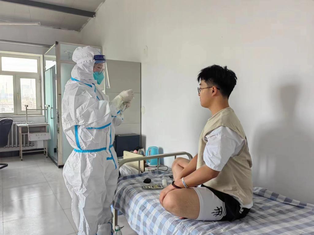 校医院医护在松北区疾控中心工作人员的指导和配合下对监测预警、启动响应、信息上报,病例流调、核酸抗原采集及转运、健康驿站运行等各环节进行了实景演练。同时区疾控现场查阅应急预案、培训演练、日常监测等材料,对乐鱼网站_乐鱼(中国)传染病疫情报告制度、防疫物资、药品储备、消毒等工作进行了细致指导。