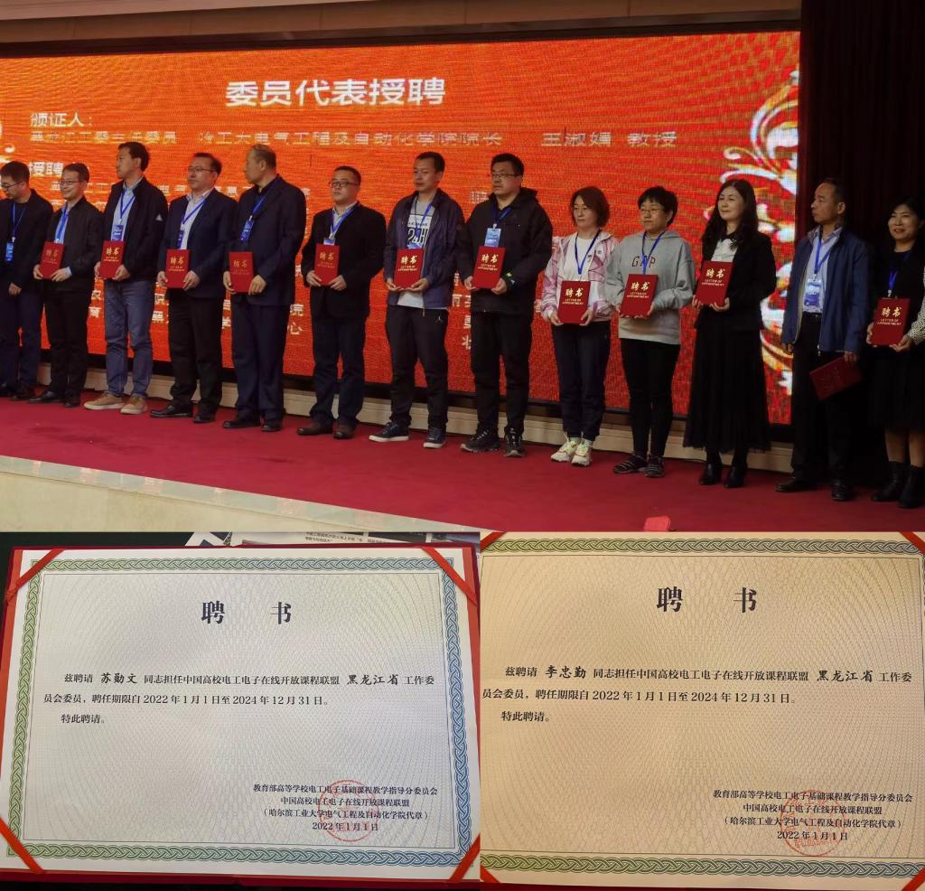 在电子电气分会场上,电气学院院长苏勋文和副院长李忠勤获聘中国高校电工电子在线开放课程联盟黑龙江省工作委员会委员,各位专家从建设一流虚拟教研室、数智时代电机学课程建设与教学评价、信息技术与电工学课程及教材深度融合创新实践、新工科课程与建材建设、深化单片机课程教学改革、加快电子电气新形态教材建设几个主题进行了深入阐述和分享,电气学院与会教师纷纷表示受益匪浅,并对电气专业课程的改革建设有了更透彻的理解。