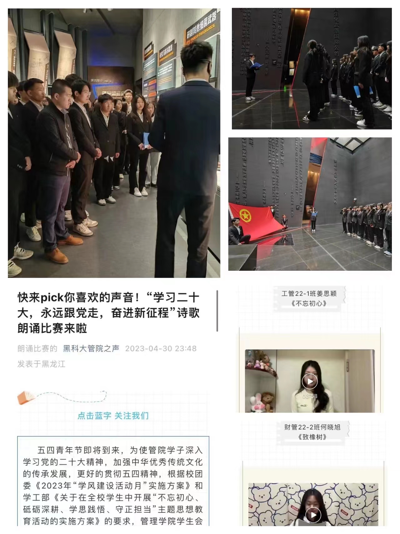 以理想信念教育为统领,培养学生的爱国主义情怀。为加强理想信念教育,教育学生不忘历史、不忘初心,知史爱党、知史爱国,管理学院学生赴侵华日军第七三一部队罪证陈列馆开展五四主题教育实践活动,让学生在学习中坚守初心,在思考中砥砺深耕,在实践中守正担当,在领悟中增强党性;开展“学习二十大,永远跟党走,奋进新征程”线上诗歌朗诵比赛,引导学生在赛中勇于担当责任意识,激发自身奋斗精神。
