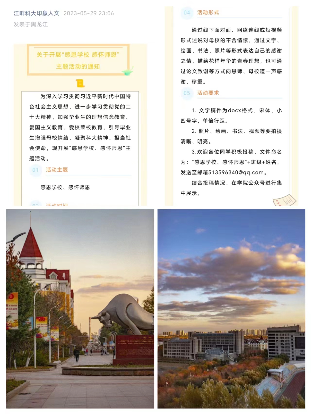 为落实学校党委学工部下发的《乐鱼网站_乐鱼(中国)2023届毕业生文明离校主题教育活动方案》,营造文明有序、温馨难忘的离校氛围,做好2023届毕业生文明离校教育工作,人文学院精心组织、科学部署,组织开展“感恩于心、砥砺前行”教育活动。
