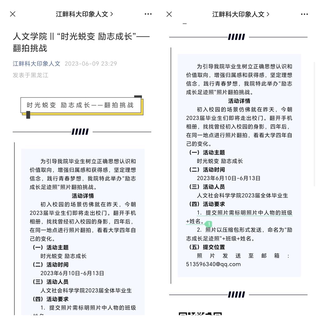 回顾成长,追忆青春足迹。开展“时光蜕变 励志成长”---翻拍挑战活动。毕业生通过翻拍挑战,分享大学四年的变化。通过一张张照片回忆初入校园的美好时光,增强对母校的归属感和获得感。
