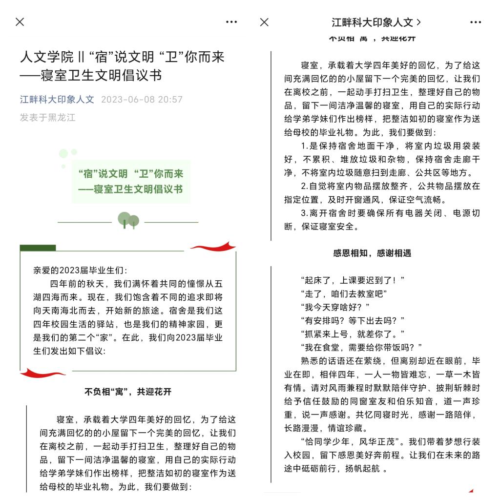 为营造文明有序、温馨难忘的离校氛围,做好2023届毕业生文明离校教育工作,人文学院精心组织开展了“季忆留夏 青春远航”毕业生文明离校教育活动。