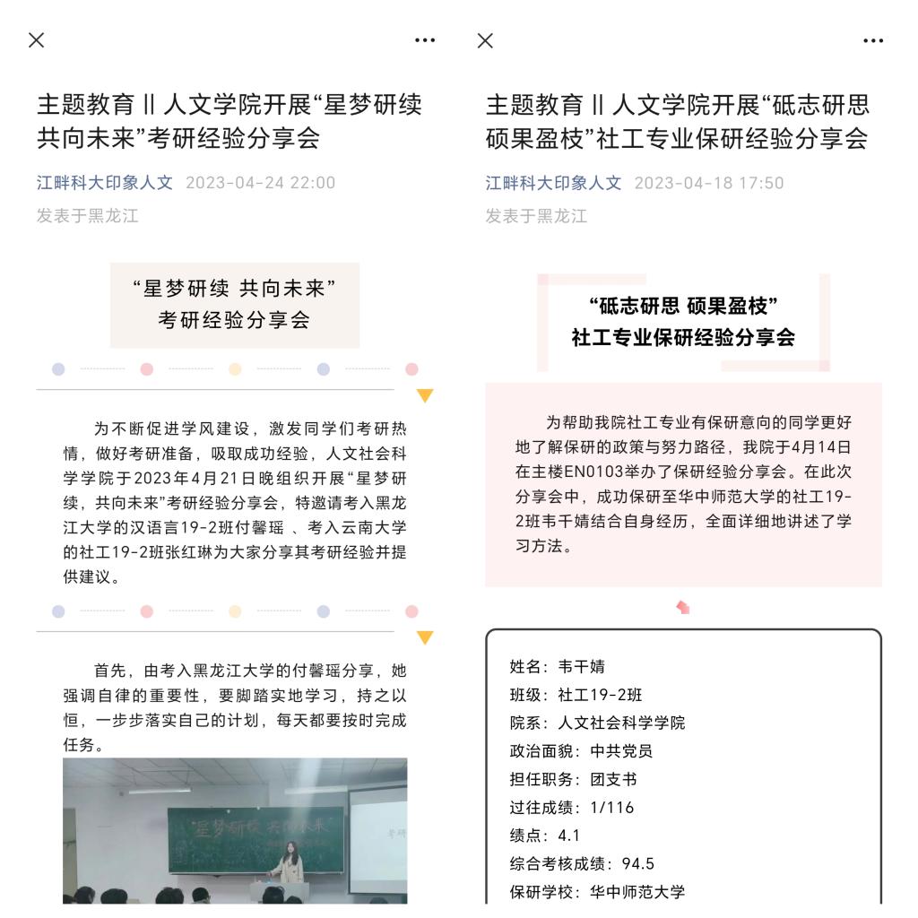 不负韶华,绽放青春色彩。开展“星梦研续共向未来”考研经验分享,“砥志研思 硕果盈枝”社工专业保研经验分享。充分发挥优秀毕业生的示范引领作用,激发学生的学习意识,鼓舞学生的考研热情,传递榜样力量,促进学风建设。