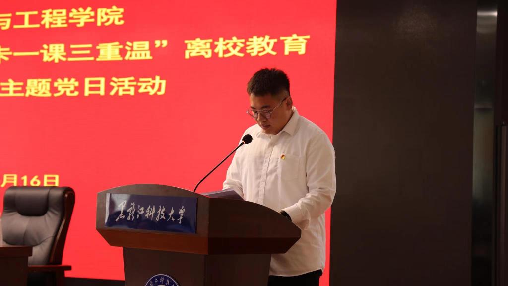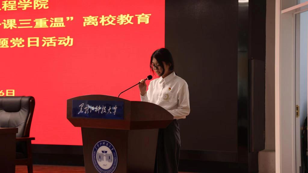 毕业生党员代表、材料学院学生第四党支部副书记、焊接2019级2班班长仉玉沣代表与会党员重温入党志愿书。